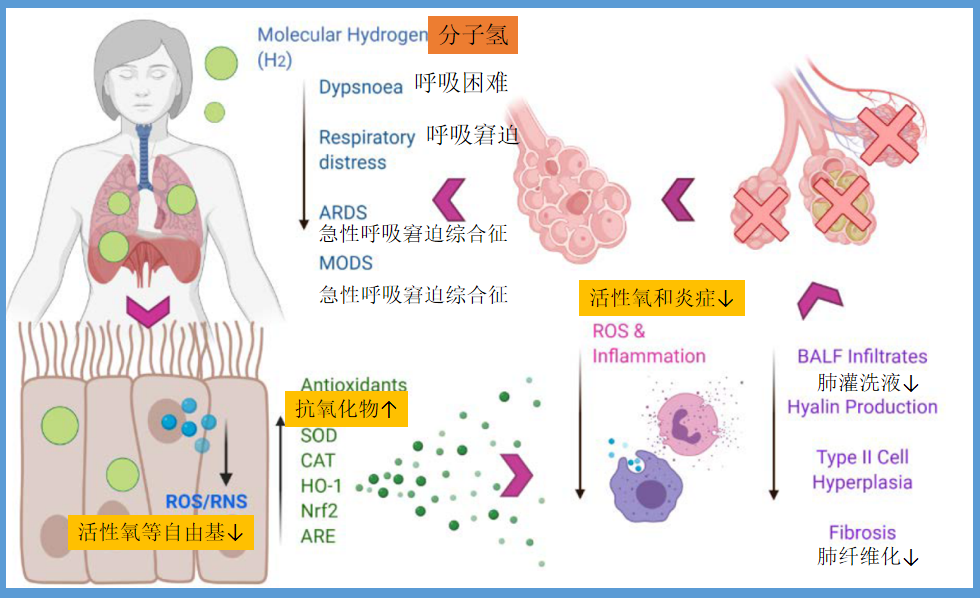 上图可知,氢分子在改善呼吸困难上发挥的作用。氢气分子降低了活性氧等自由基,减轻了肺部的炎症反应。