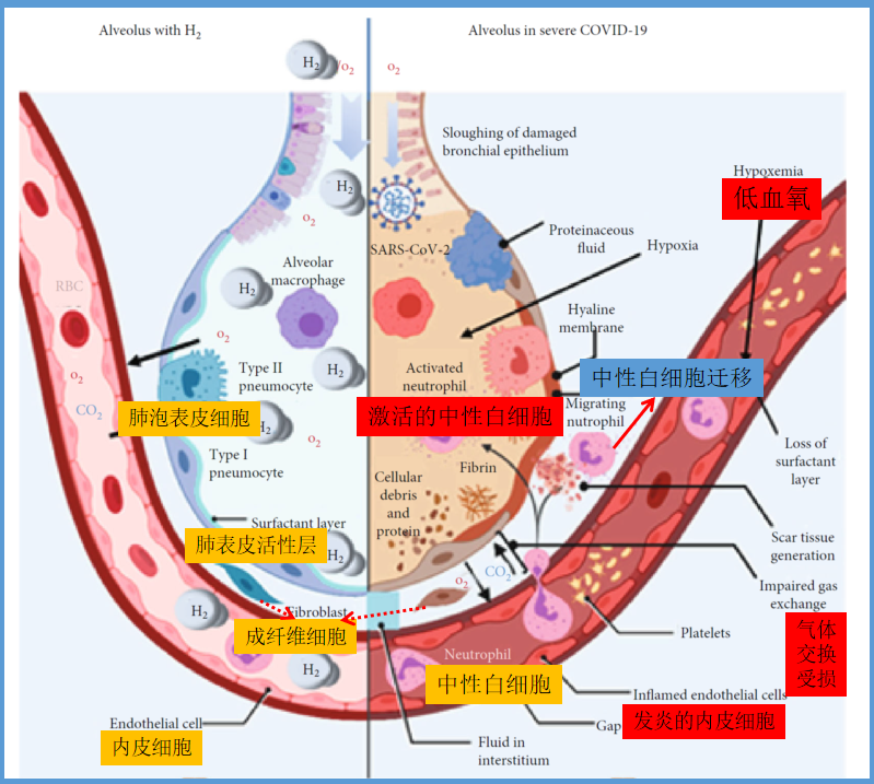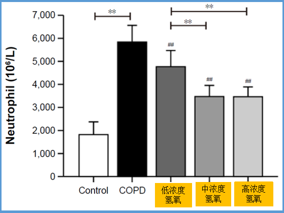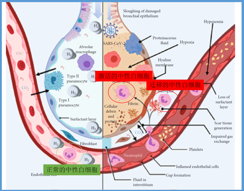 在炎症影响肺泡组织气体交换的构图中,我们已经看到中性白细胞激活和迁移带来的负面作用。这进一步说明了高浓度氢氧分子在对抗慢性阻塞性肺疾病时的抗炎、保护肺部功能的作用。