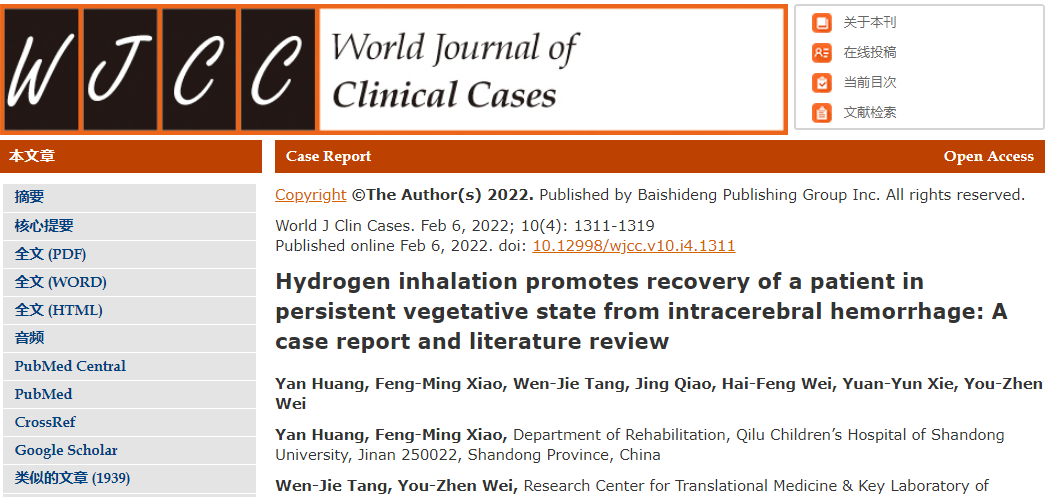 参考资料: 【1】 You-Zhen Wei et al,Hydrogen inhalation promotes recovery of a patient in persistent vegetative state from intracerebral hemorrhage: A case report and literature review,吸入氢气促进脑出血后持续植物状态患者的康复:一例病例报告和文献综述,,World Journal of Clinical Cases 2022 ;10(4):1311~1319. 【2】HirohisaOno et al,氢气吸入治疗急性脑梗死,Hydrogen Gas Inhalation Treatment in Acute Cerebral Infarction-ARandomized Con,The Journal of Stroke & Cerebrovascular Diseases 2017;26(11):2587-2594; 【3】Yoshinori Katsumata et al,The Effects of Hydrogen Gas Inhalation on Adverse Left Ventricular Remodeling After Percutaneous Coronary Intervention for ST-Elevated Myocardial Infarction ,吸入氢气对ST段抬高心肌梗死经皮冠状动脉介入治疗后不良左室重构的影响,circ J 2017 ;81(7):940-947; 【4】Chi et al,Inhalation of water electrolysis-derived hydrogen ameliorates cerebral ischemia-reperfusion injury in rats - A possible new hydrogen resource for clinical use,氢气的生物安全性研究及对大鼠脑缺血再灌注损伤的保护作用. Neuroscience 2016;9(3):74~79; 【5】Zhang et al,Hydrogen gas therapy improves survival rate and neurological deficits in subarachnoid hemorrhage rats: a pilot study,氢气疗法提高蛛网膜下腔出血大鼠的存活率和神经功能缺损:一项初步研究,Research article 2019;9(2),3:1~6; 【6】Wan-chao Yang et al,Molecular hydrogen alleviates lung injury after traumatic brain injury: Pyroptosis and apoptosis,分子氢减轻创伤性脑损伤后肺损伤:细胞焦亡和凋亡,ELSEVIER 2022 ;914(2022):1~9;