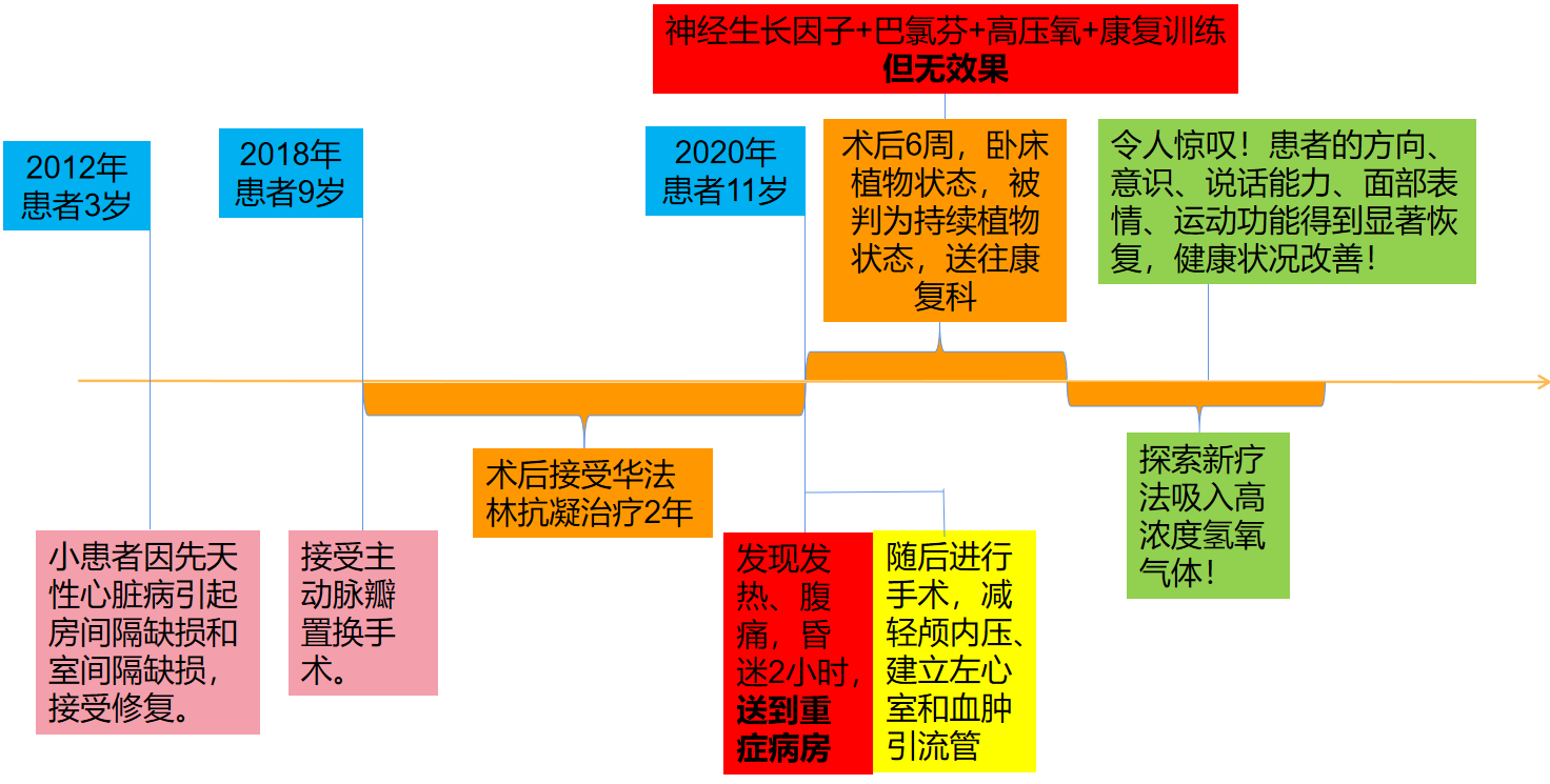 一位11岁的男孩因心脏手术引起严重左半球脑出血的持续植物状态,在综合康复治疗2个月后,无任何明显改善。在家属同意下,每日给予高浓度氢氧混合气体(66.6%氢气+33.3%氧气)吸入,患者意识逐渐恢复,多项功能得到显著恢复,健康状况也得到改善。