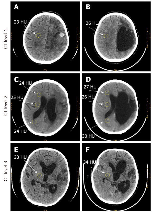 A、C、E:手术前在左半球观察到严重和大规模出血,包括覆盖左侧前额叶和顶叶区域以及大部分枕回的CT图像密度降低。和右侧相比,左侧脑室明显增大,并且由于血肿和脑水肿,中线脑结构也偏离了正常位置;